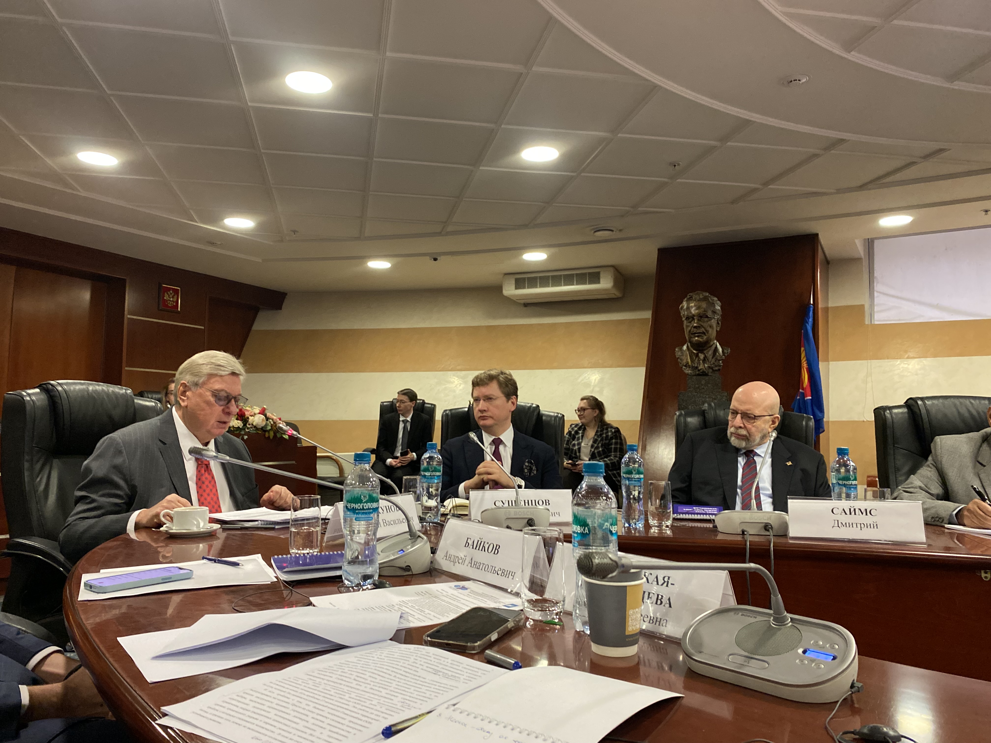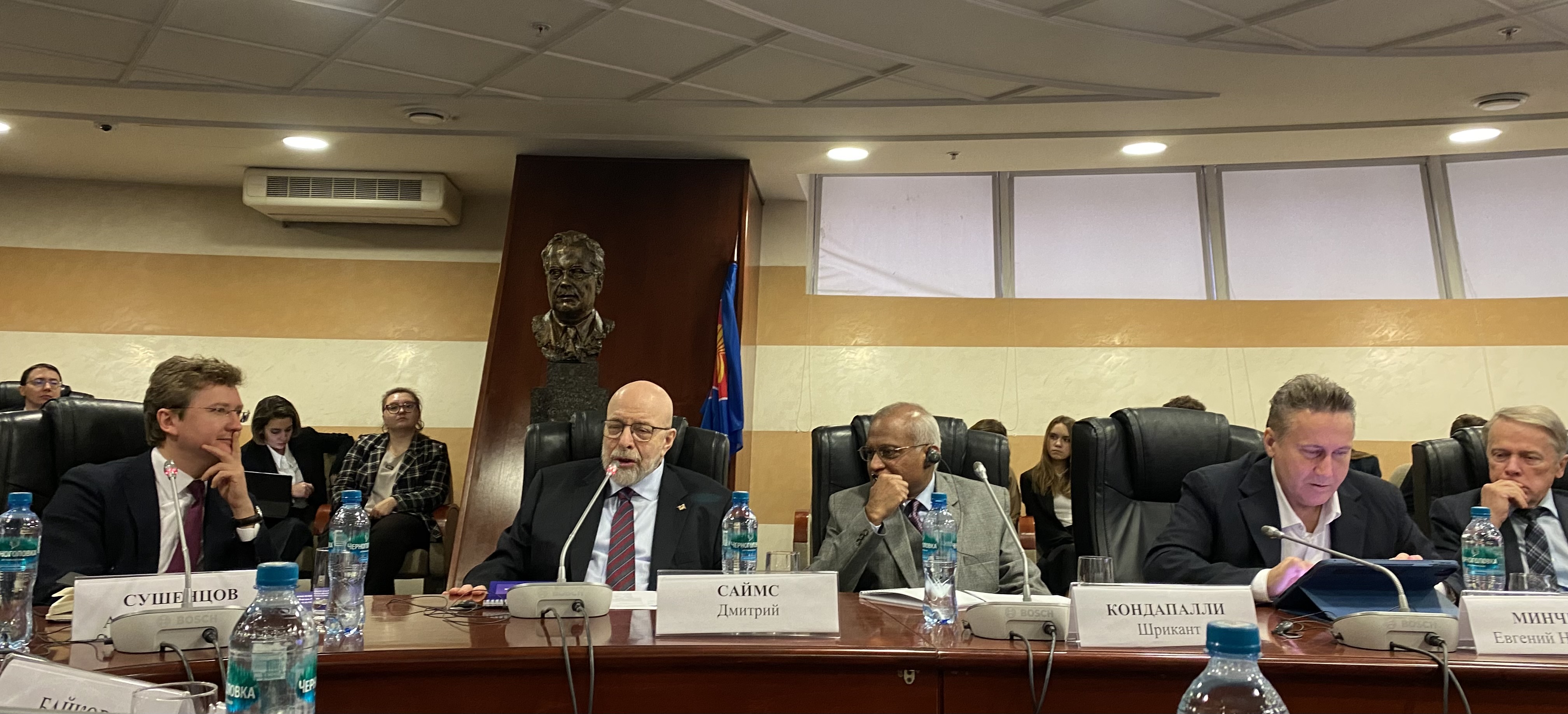 В пленарной сессии конференции «Глобальная турбулентность: возможна ли новая архитектура безопасности в Евразии?» приняли участие ректор МГИМО академик А.В.Торкунов, проректор по научной работе А.А.Байков, заместитель директора Департамента внешнеполитического планирования МИД России М.С.Ходынская-Голенищева, профессор МГИМО, ведущий программы «Большая игра» на Первом канале Д.Саймс, профессор Центра восточноазиатских исследований Университета Джавахарлала Неру Шрикант Кондапалли, профессор Института международных исследований Фуданьского университета (КНР) Чжао Хуашэн. Модератором сессии выступил декан Факультета международных отношений А.А.Сушенцов.